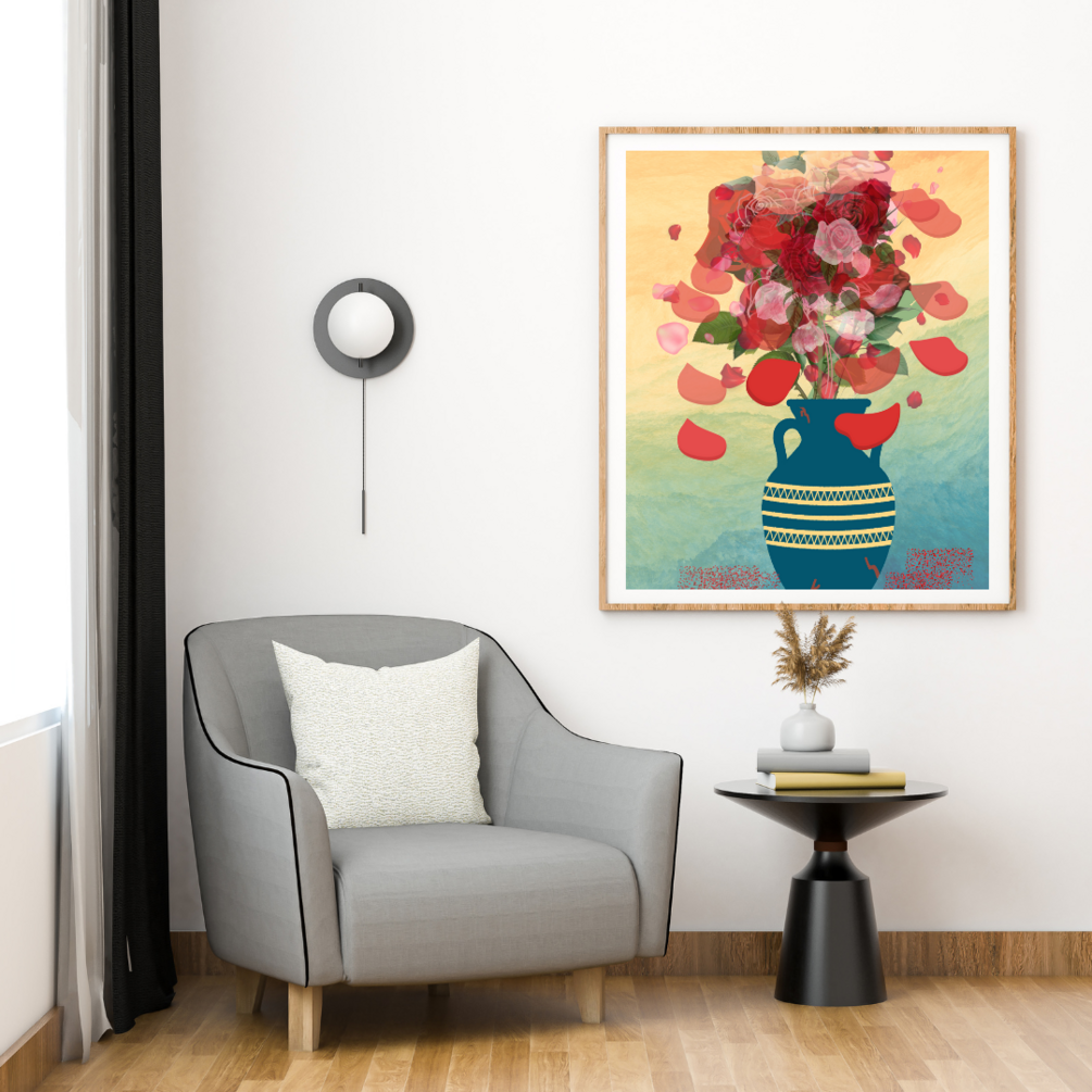 The setting is primarily composed of pastel hues. The overall mood is that of a flower or bouquet in a vase, with a touch of movement and abstraction, creating a sense of lightness and escape. The pale yellow and light orange hues in the background suggest a subtle sunrise or sunset. The soft contours of the backgrounds contribute to this sense of softness, creating a gentle and dreamy atmosphere. The muted colors and texture lend a touch of mystery to the image.